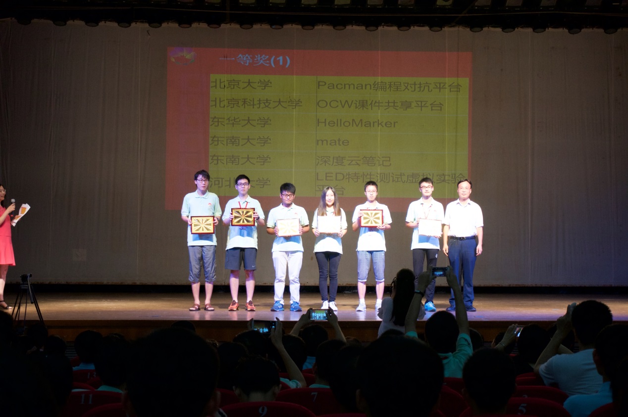 信安1301班的曹宇宁、物联1301班的王梧蓉、土资成人a片建环1301班白思琦共同开发的“OCW课件共享平台”获得软件应用与开发类决赛一等奖,该奖项得奖率约6%。此外,“课堂动力、动物那些事儿、诗经风韵、趣学形参传递、初中数学——全等三角形的判定方法、3D幻影互动、Transbest、奇妙的视觉欺骗、有一种游戏叫线性代数、《Faded》Launchpad MIDI控制工程”等10件作品分别获得微课与课件等5个类别的二、三等奖及优胜奖。