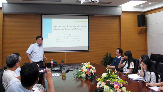 孙昌爱教授邀请,美国博伊西州立大学(Boise State University)徐殿祥教授来我校进行为期7天的学术交流与合作。2016年6月28日下午,徐殿祥教授在机电信息楼601作了题为“访问控制策略的自动化故障定位”的学术报告。报告会由孙昌爱教授主持,20余名师生参加了报告会。