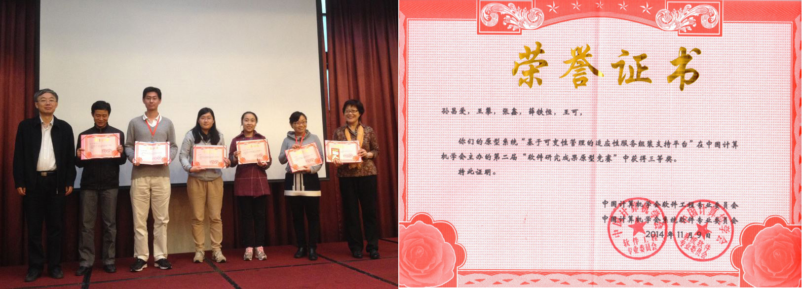 教授孙昌爱及团队的项目“基于可变性管理的适应性服务组装支持平台”以极高的评价获三等奖。闭幕式上,中国计算机学会软件工程专委会主任吕建院士为获奖者颁奖。