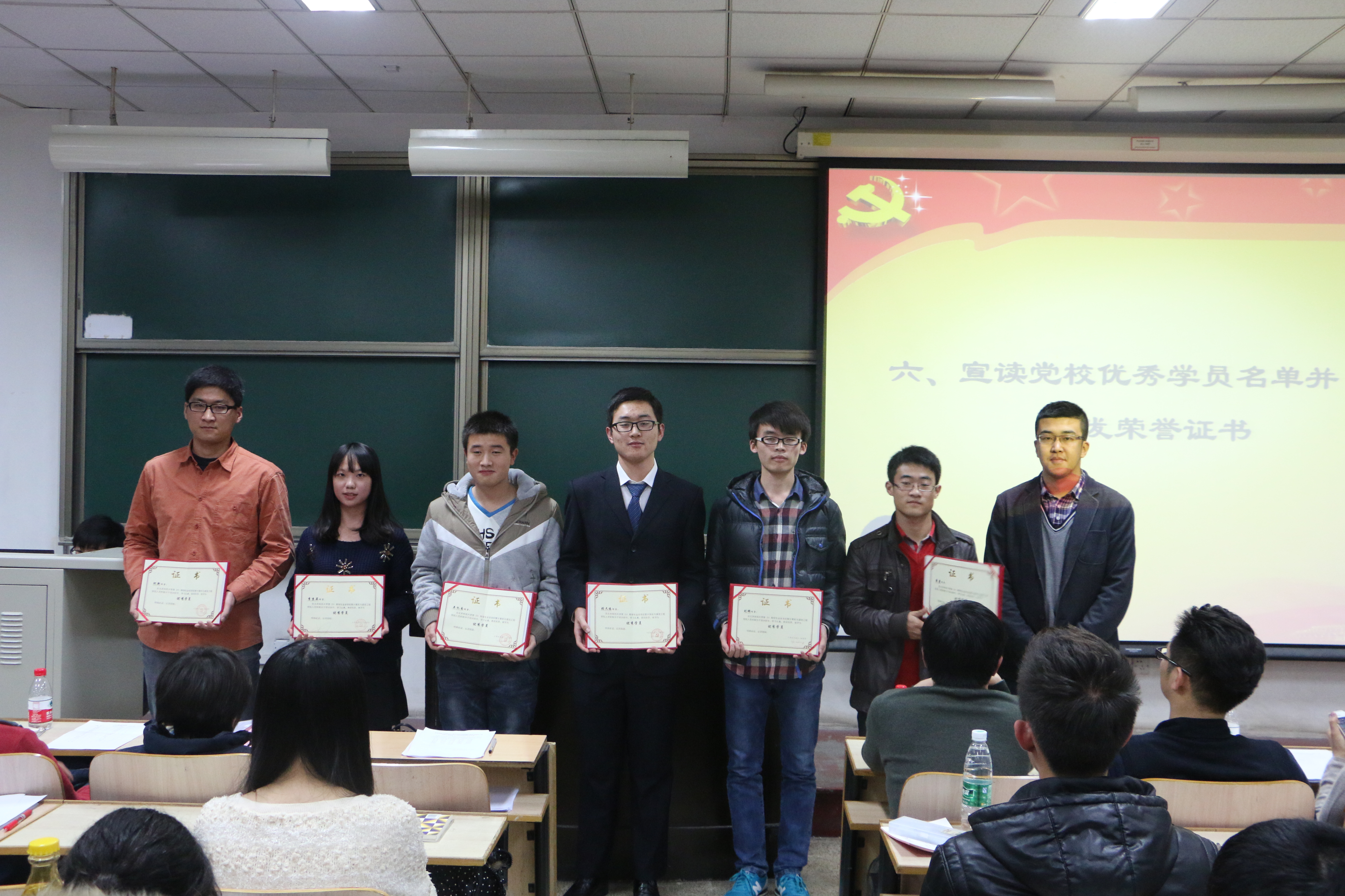 班级分组展示后,党校班主任马力、于群分别为各班代表和优秀学员代表颁发了结业证书和奖状。本期党校六个班级共有215名学员参加了培训,其中209名学员达到党校要求的结业标准,取得结业资格,并有27名同学被评为“优秀学员”。党校三班吴忆南同学作为优秀学员代表进行了发言。在发言中,她结合自己的培训经历,与大家分享了在本期党校学习中的成长和收获,并从日常的学习和生活入手,阐述了自己对于学生党员角色及应发挥的作用的认识,表达了今后要以更加优异的表现争取早日加入党组织的决心。