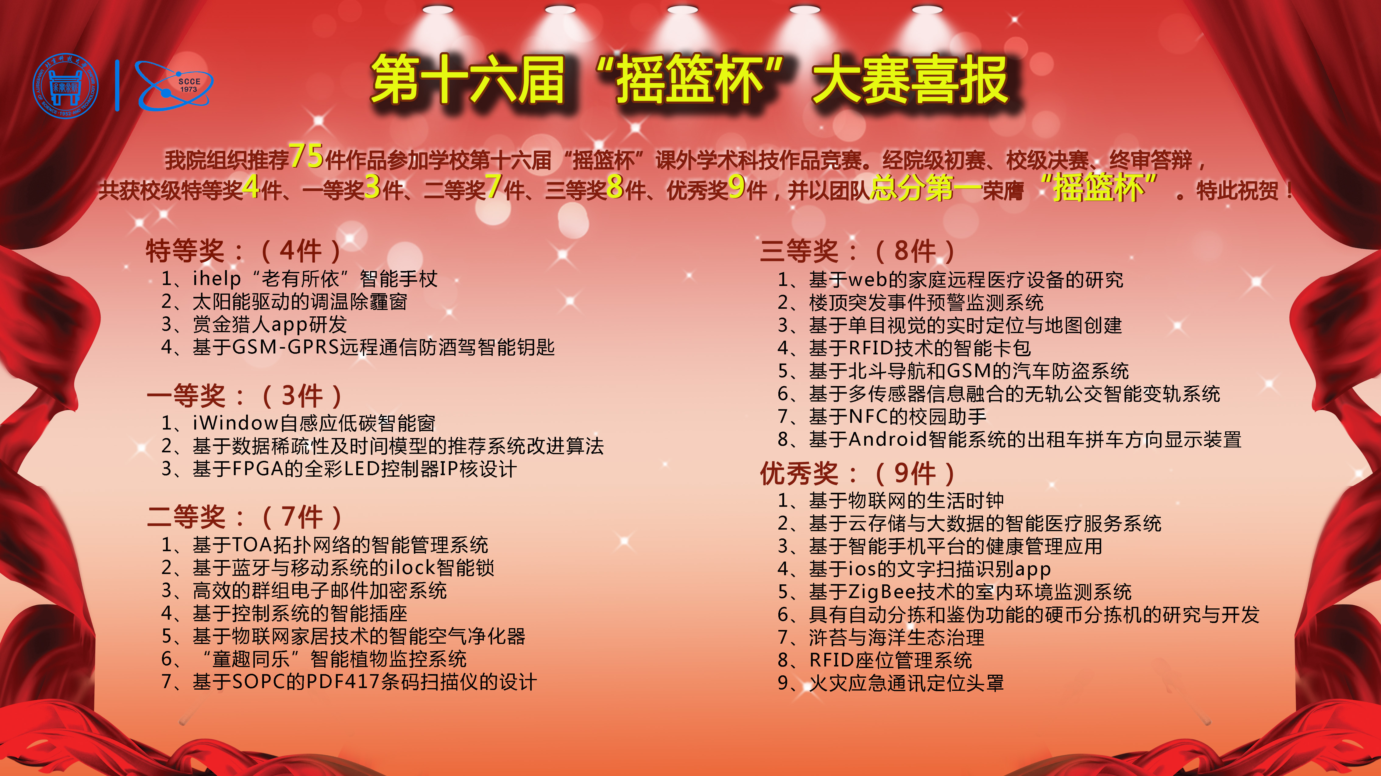 取得优异成绩,以团队总分第一荣膺“摇篮杯”。成人a片共组织推荐75件作品参加此次竞赛,经过院级初审、校级决赛、终审答辩等环节,最终获校级特等奖4件,一等奖3件,二等奖7件,三等奖8件,优秀奖9件。
