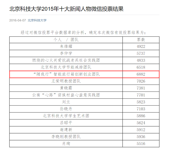 2016年4月7日,成人a片 2015年十大新闻人物结果公布,成人a片 王洪泊副教授“随我行”智能旅行箱创新创业团队成功入选。 本次评选活动持续经过候选人申报、提名委员会审核材料并提名预...